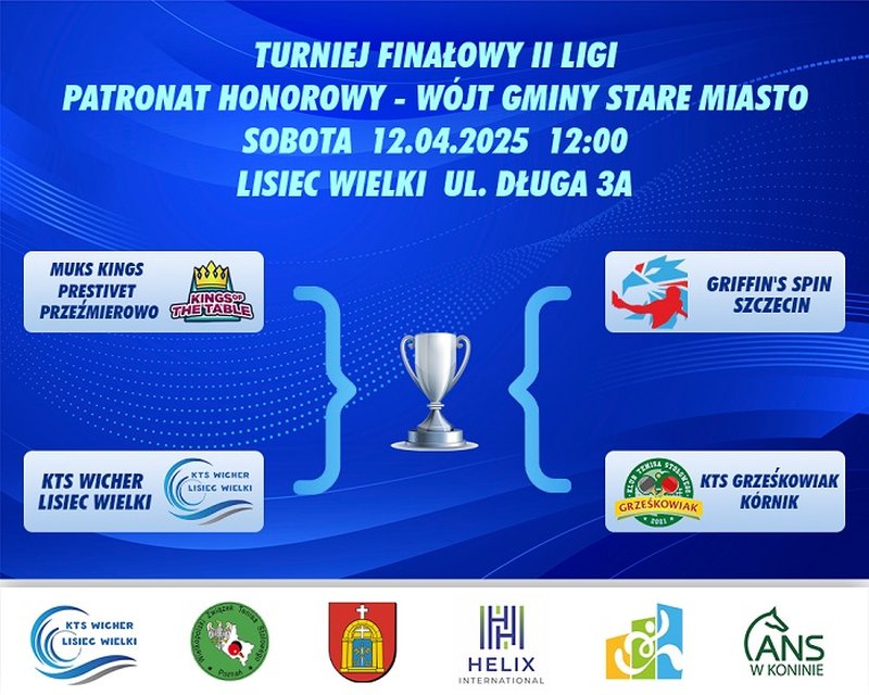 W Liścu Wielkim rozegrany zostanie finałowy turniej o pierwsze miejsce w rozgrywkach II ligi mężczyzn, która swym zasięgiem obejmuje województwa wielkopolskie i zachodniopomorskie. Zwycięzca uzyska prawo do gry w barażach o awans do II ligi, gdzie zmierzy się z najlepszą drużyną z II ligi kujawsko-pomorskiej lub pomorskiej. W turnieju finałowym udział wezmą: MUKS I Kings Prestivet Przeźmierowo, Griffin's-Spin Szczecin, KTS Grześkowiak Kórnik i KTS Wicher Lisiec Wielki (gospodarz). Zawody rozegrane zostaną systemem każdy z każdym. Początek zmagań w sobotę 12 kwietnia o godz. 12. W tym samym dniu rozegrany zostanie w Świdwinie, turniej o utrzymanie się w II lidze, w którym zmierzą się: Technik Świdwin (gospodarz), Visonex LUKS TOP Wierzbięcin, SPKS Piast Poniec i LKS Wielkopolska II Komorniki. Zawody rozegrane zostaną systemem każdy z każdym, a dwie najlepsze drużyny zachowają ligowy byt. Początek zmagań o godz. 11.