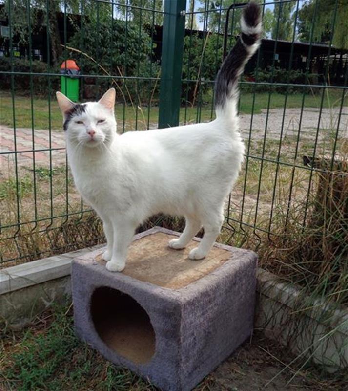 Albin trafił do schroniska w połowie czerwca. Został znaleziony przy ul. Janickiego (Pogodno). To spokojny i dojrzały, 7-letni kastrat. Pięknie umaszczony, niemal śnieżnobiały: z zabawnymi i charakterystycznymi łatami na głowie i ogonie. Jest teraz rezydentem tzw. kociarni żółtej, a jego numer ewidencyjny to 127/18.