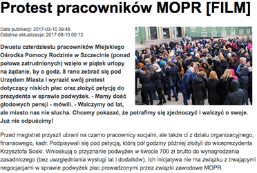 Relację z głośnej manifestacji pod Urzędem Miasta osób zatrudnionych w Miejskim Ośrodku Pomocy Rodzinie w Szczecinie, którzy domagali się podwyżek płac, można było obejrzeć także na filmie.