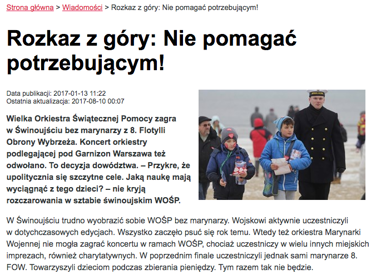 Mowa w nim była o tym, że inaczej niż w poprzednich latach marynarze z 8. Flotylli Obrony Wybrzeża nie wezmą udziału w finale Wielkiej Orkiestry Świątecznej Pomocy.