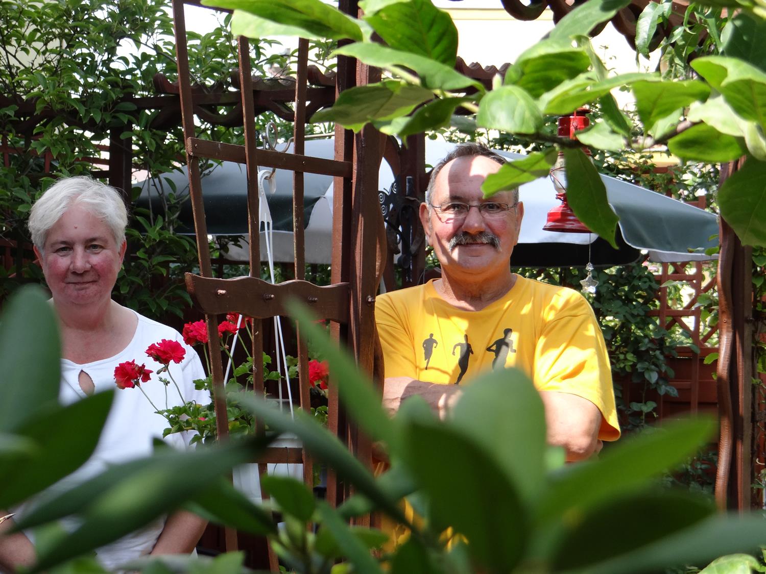 Pan Jan po chwili prowadzi nas do kolejnego zakątka zielonej enklawy z magnolią królewską, a spod jej rozłożystych gałęzi wskazuje już inny zaułek z kwiatowym gazonem wypełnionym w kształcie łabędzia z…opony. Wypełniony pelargoniami. To autorski pomysł pana Jana, podobnie jak większość pergoli, po których pną się m.in. clematisy. Jest i bocianie gniazdo, są karmniki. Winorośl okrywa płot z siatki tworzy dodatkową zieloną ścianę.