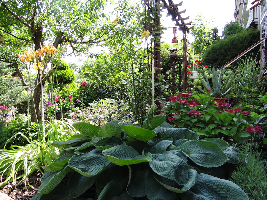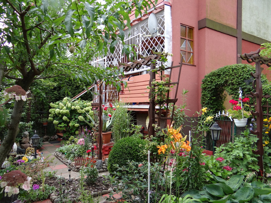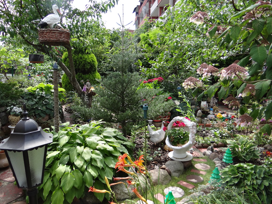 Dlatego cały ogród pełen jest perłowych liści, szklanych motyli, gdzie elfy mają swój gliniany domek przy skalniaku. Natknąć się tu też można na węża, ale – bez obaw – rzeźbionego w drewnie. Na rabatach hortensje, róże, piwonie, tulipany, rododendrony, irysy, dalie, świerczek, tuje, funkie białe i fioletowe, bambus, bukszpan, storczyk ogrodowy, oleander, jodła koreańska. Obok 16-letniej magnolii znalazło się miejsce także dla brzoskwini, kalinę, a w kąciku wypoczynkowym na kiwi miniaturkę prowadzoną w formie piennej.
