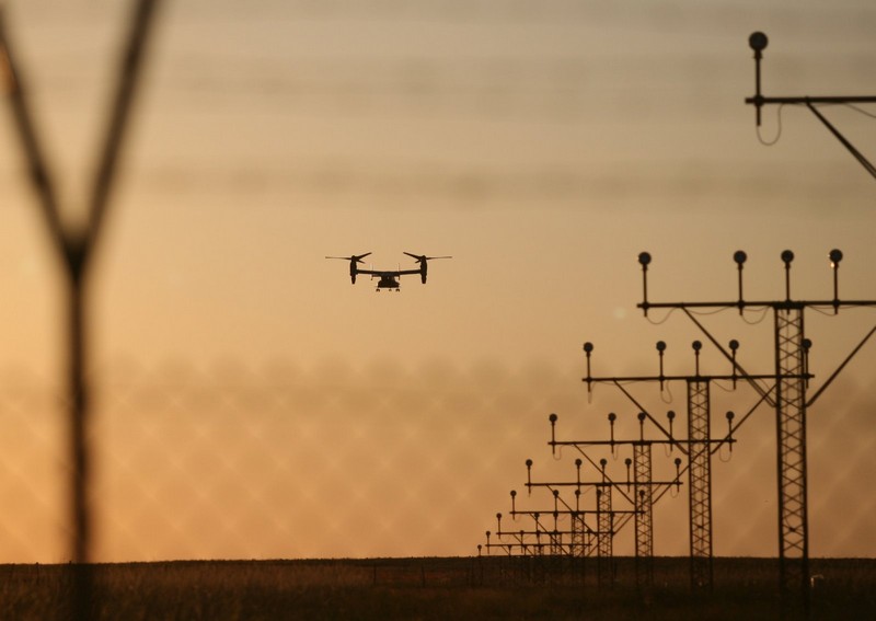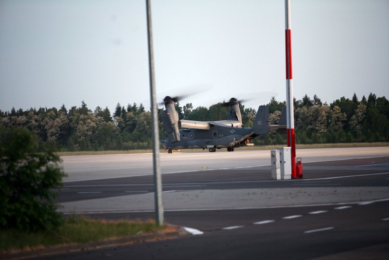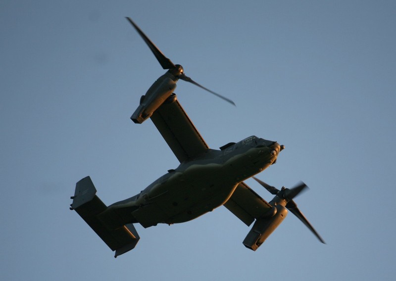 Ale przed godziną 20 niespodzianka! Znad drzew wyłoniła się charakterystyczna sylwetka Ospreya – samolotu mogącego lądować i startować pionowo. Bell-Boeing V-22 Osprey obniżył lot, zawisł na początku pasa startowego, po czym wzniósł się w powietrze, zrobił koło w rejonie lotniska i wykonał drugie podejście do lądowania, zakończone postojem na płycie lotniska. Po prawie godzinie samolot wystartował w lot powrotny.
