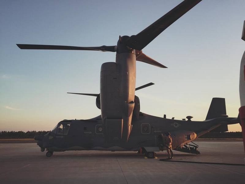Osprey pierwszy raz pojawił się na goleniowskim lotnisku. Wcześniej (w roku 2015) widziano go w rejonie Warszawy w czasie ćwiczeń z polskim GROM-em. Samolot ma nietypową konstrukcję: dwie gondole silnikowe można obracać, dzięki czemu w locie poziomym zachowuje się jak zwykły samolot, zaś po obróceniu gondoli pionowo samolot może startować i lądować pionowo, jak helikopter. Jest to więc połączenie dwóch typów statku powietrznego, wyjątkowo przydatne wojskom desantowym. Większość Ospreyów stanowi wyposażenie amerykańskiej piechoty morskiej.