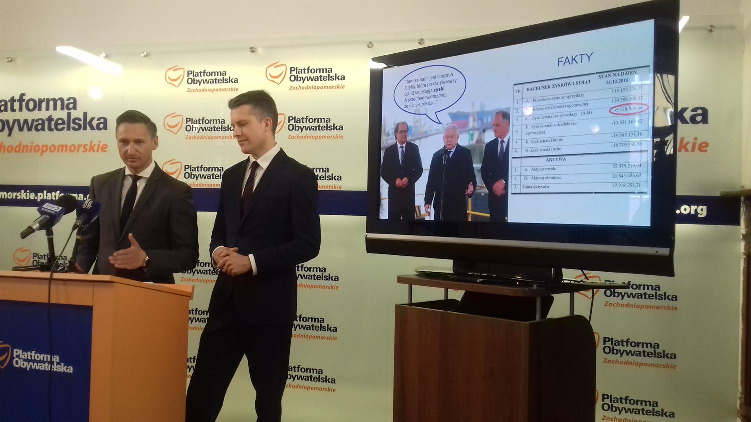 Politycy PO, marszałek województwa Olgierd Geblewicz oraz poseł Arkadiusz Marchewka, zorganizowali w środę konferencję prasową poświęconą sytuacji w Morskiej Stoczni Remontowej Gryfia.