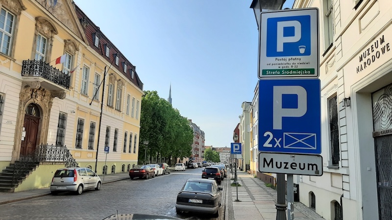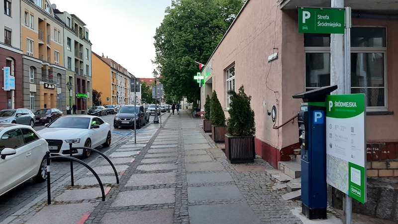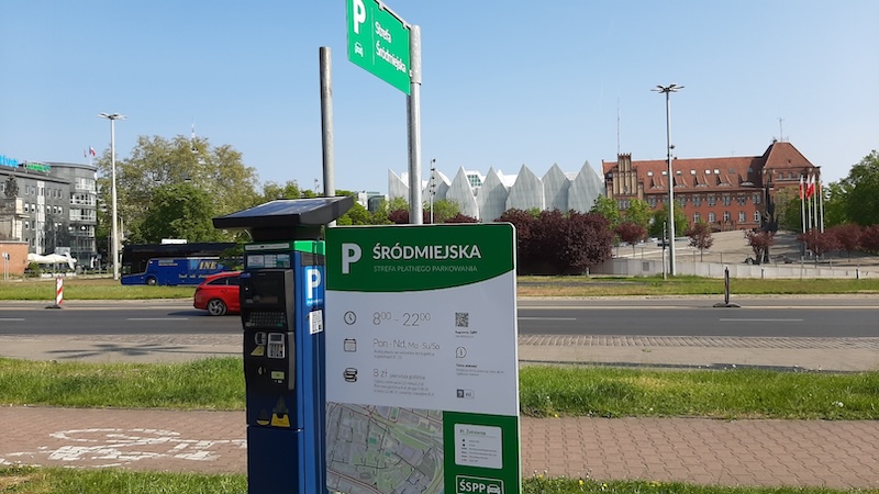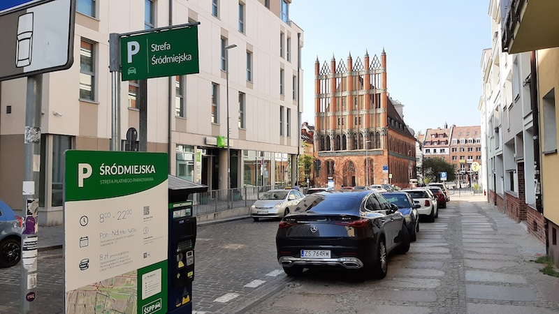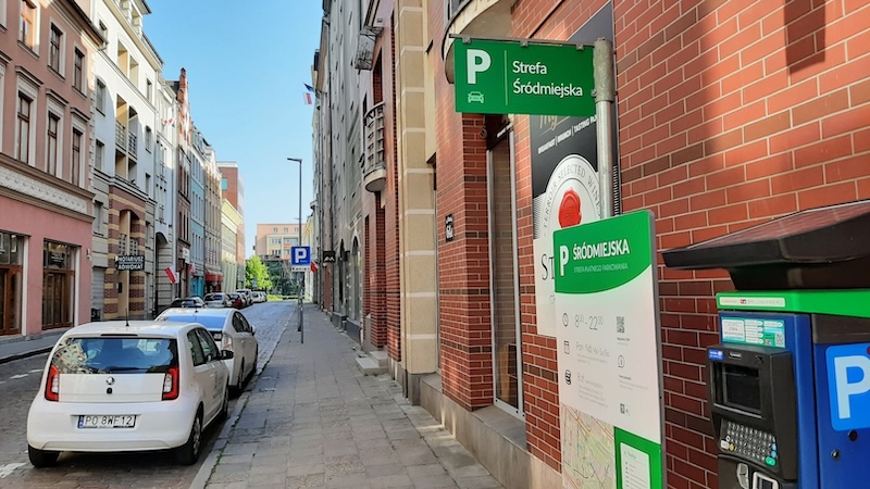Na zdjęciu: Ulica Staromłyńska. Na górze znak D-44 "strefa parkowania" oznacza wjazd do strefy, w której za postój pojazdu jest pobierana opłata. Napis na zielonym polu: „Strefa Śródmiejska”. Takie znaki są na wszystkich wjazdach do ŚSPP.