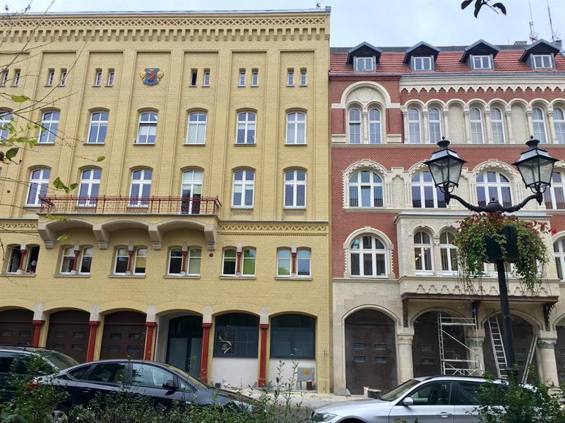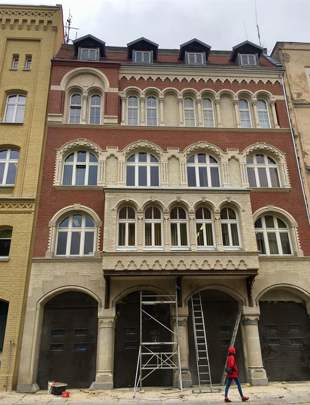 Zostały rozpoczęte jeszcze w sierpniu, a z finałem zaplanowanym na 15 listopada. W tym czasie przeprowadzono przede wszystkim konserwację cegły i detalu ceramicznego, konserwację kamienia oraz elementów metalowych i drewnianych. Wymyto je, podobnie jak gipsowe płyciny, tynki i kartusz. Wymieniono spoiny i jak wszystkie inne zniszczone detale - choćby ceramiczne kapitele - uzupełniono. Ceglaną okładzinę ścian zabezpieczono chemią przeciwko przenikaniu wilgoci (hydrofibizacja) oraz osadzaniu się glonów. Następnie wszystko co na fasadach się znajduje na nowo odmalowano. W tym charakterystycznego gryfa, górującego nad najstarszą częścią budynków.