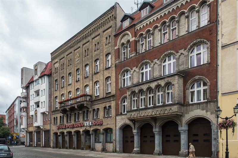 Zespół budynków zajmowanych przez szczecińską straż pożarną (ul. Grodzka 1-5) jest XIX-wieczny. Jego najstarsza część - tzw. 7-osiowa, zachodnia - została zbudowana w 1868 r. według projektu i pod nadzorem ówczesnego miejskiego radcy budowlanego Jamesa Hobrechta (zasłynął jako projektant generalny planu rozbudowy Berlina z lat 1859-81 - przyp. aut.). Część wschodnia (ul. Grodzka 5) została dobudowana później (1896 r.), ale do dziś nie zachowały się dane na temat projektanta. To wówczas do głównego budynku zostały dołączone sąsiednie działki od ul. Tkackiej, gdzie następnie stanęła wspinalnia i warsztaty. Ostatnia przebudowa zespołu budynków strażackich (1912 r.) nastąpiła, gdy wozy konne zastąpiono samochodami gaśniczymi. Wówczas od zaplecza, czyli dziedzińca służącego za plac ćwiczeń, zbudowano m.in. wozownię.