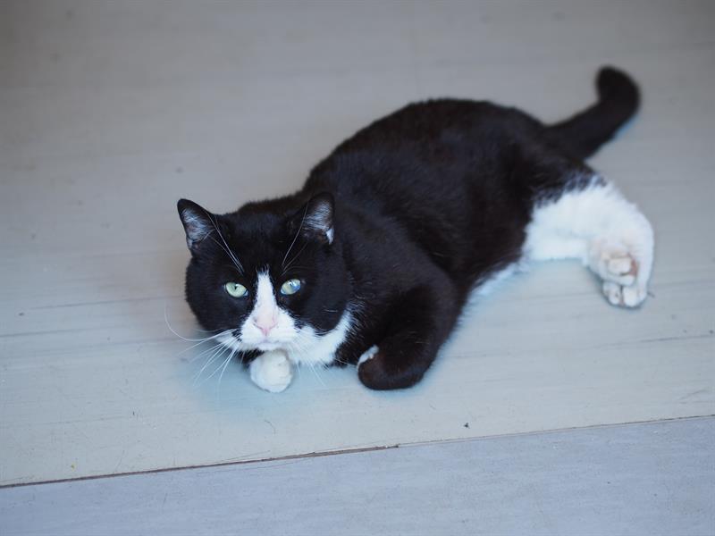 Jest mieszańcem w typie popularnie zwanym pingwinkiem. Ma bowiem biały pyszczek, „krawat" i białe końcówki łap, gdy resztę jego futerka spowija czarny frak.