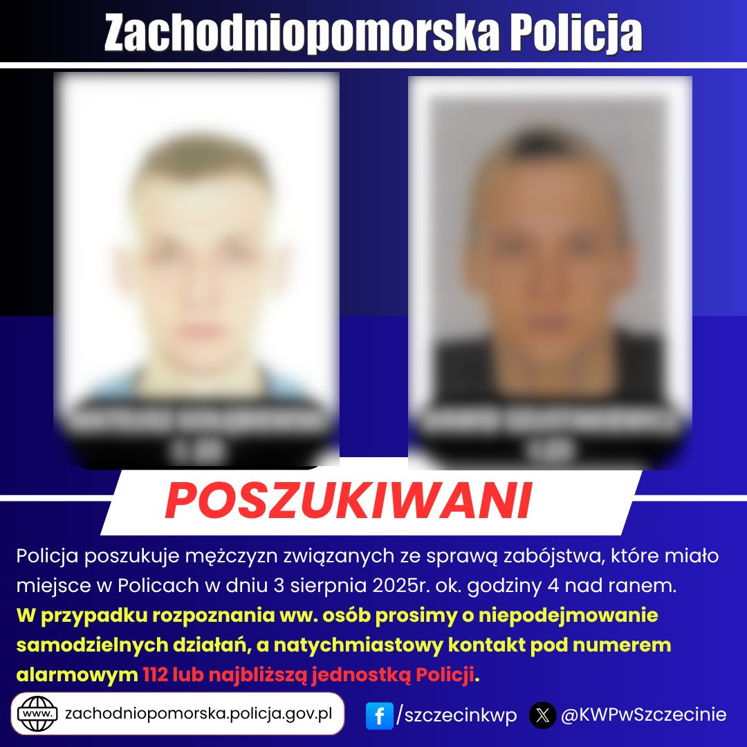 W specjalnym komunikacie zachodniopomorska policja w poniedziałek po południu poinformowała o tym, że poszukuje dwóch mężczyzn związanych ze sprawą zabójstwa, do którego doszło w niedzielę (3 sierpnia) ok. godziny 4 nad ranem na deptaku spacerowym przy ul. Wyszyńskiego w Policach.