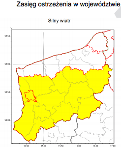Ostrzeżenie dotyczy większości powiatów województwa zachodniopomorskiego poza strefą nadmorską. Obowiązuje 1 stycznia 2019 r. od godz. 8 do godz. 20. W tym czasie przewiduje się wystąpienie silnego wiatru o średniej prędkości od 35 km/h do 45 km/h, w porywach do 75 km/h z zachodu.