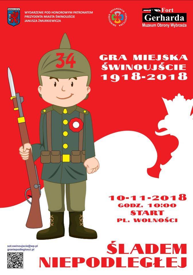 Świnoujście. W sobotę o g. 10.30 na placu Wolności rozpocznie się gra miejska, w której uczestnicy otrzymają zadania, będą trafiać do różnych miejsc na wyspie Uznam i odpowiadać na pytania dotyczące historii Polski. Przewidziano atrakcyjne nagrody. Zwycięzca otrzyma 1500 zł. Będą też pieniężne nagrody losowe. Gra potrwa do g. 15.30. Będzie można rejestrować się w dniu imprezy, ale organizatorzy sugerują, by zrobić to wcześniej na stronie internetowej graniepodleglosci.pl. Organizatorem wydarzenia jest Świnoujska Organizacja Turystyczna.