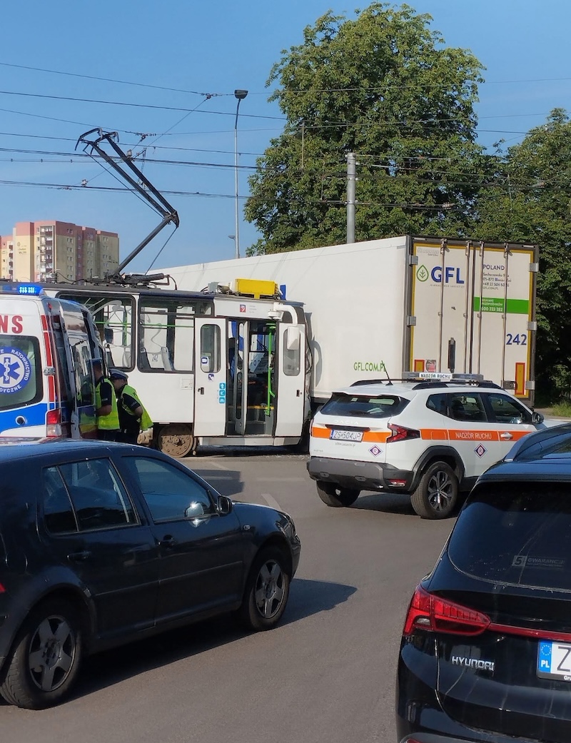 Do zdarzenia doszło, gdy tramwaj zjeżdżając z ronda, wjechał w okrążającą je ciężarówkę. Na miejscu pracują służby. W okolicy wypadku tworzą się korki.