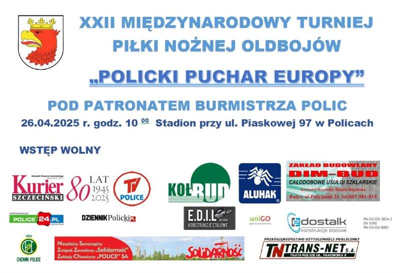 To będzie XXII Międzynarodowy Turniej Piłki Nożnej Oldbojów pn. "Policki Puchar Europy". Rozegrany zostanie w najbliższą sobotę (26 kwietnia) na stadionie przy ul. Piaskowej 97 w Policach.