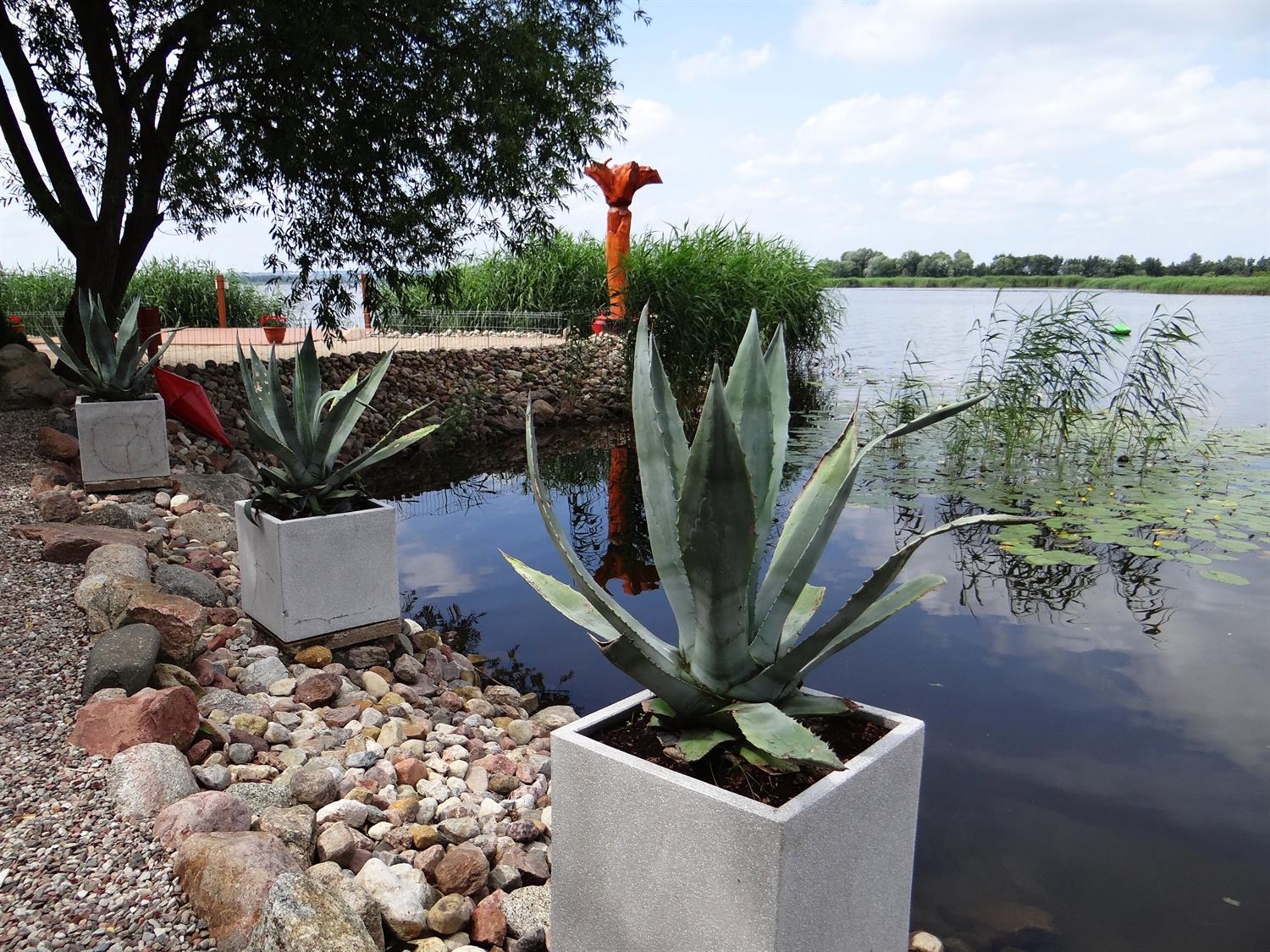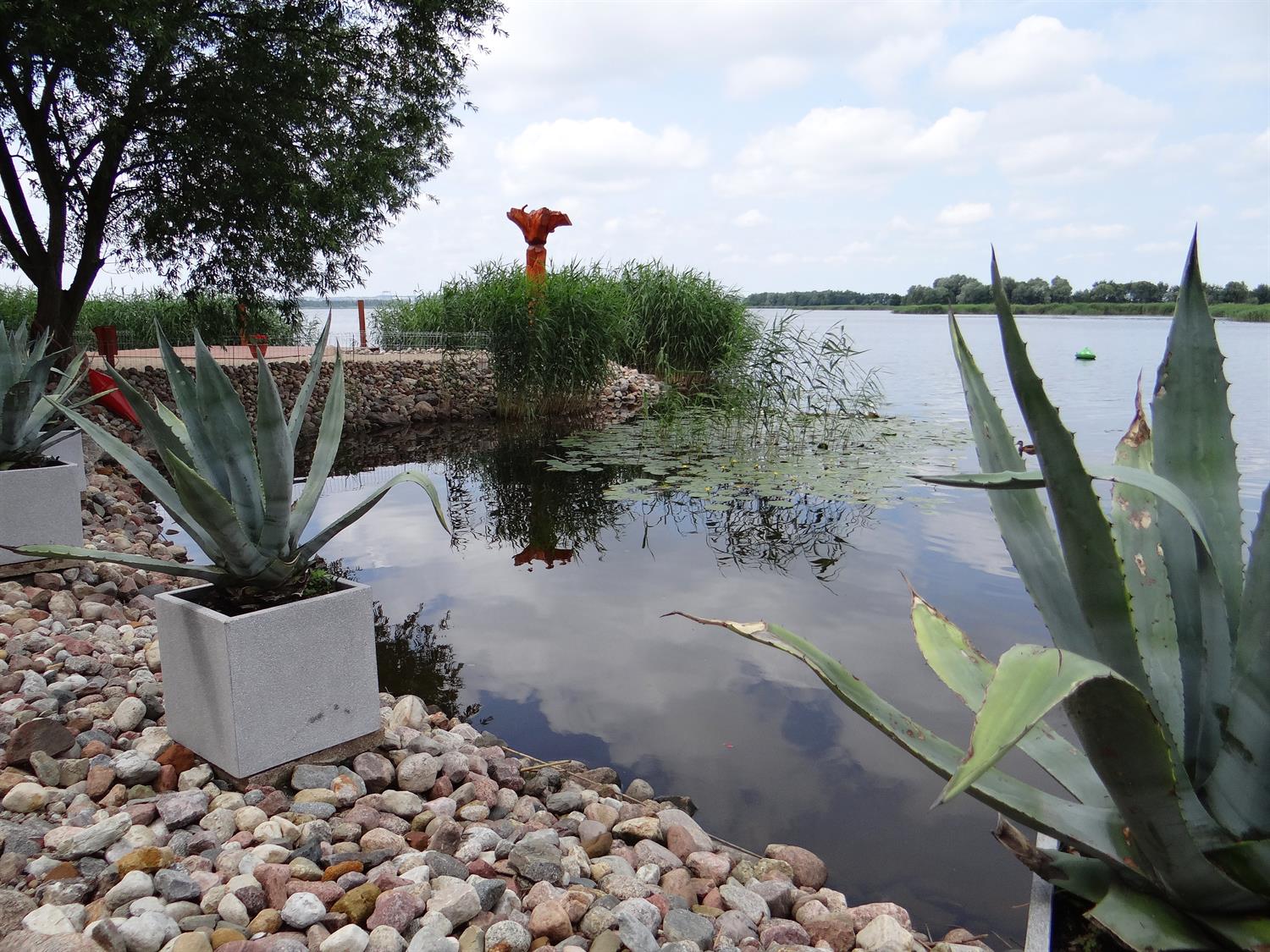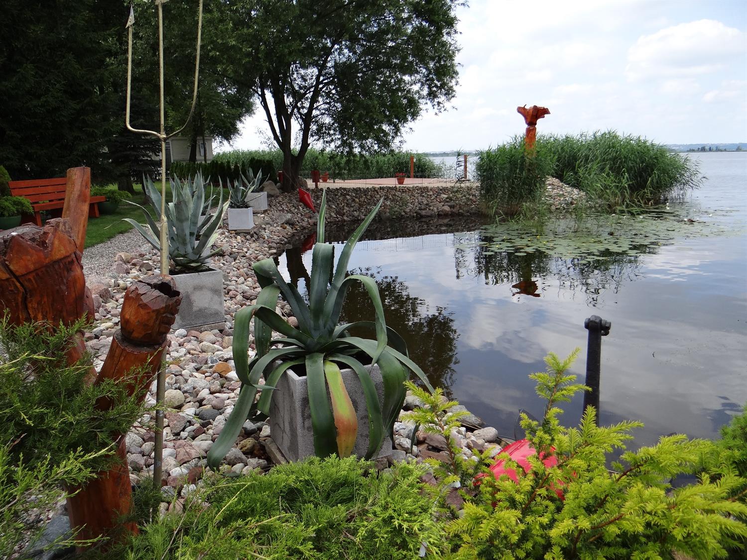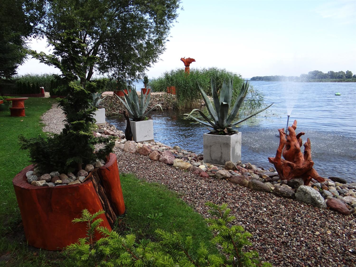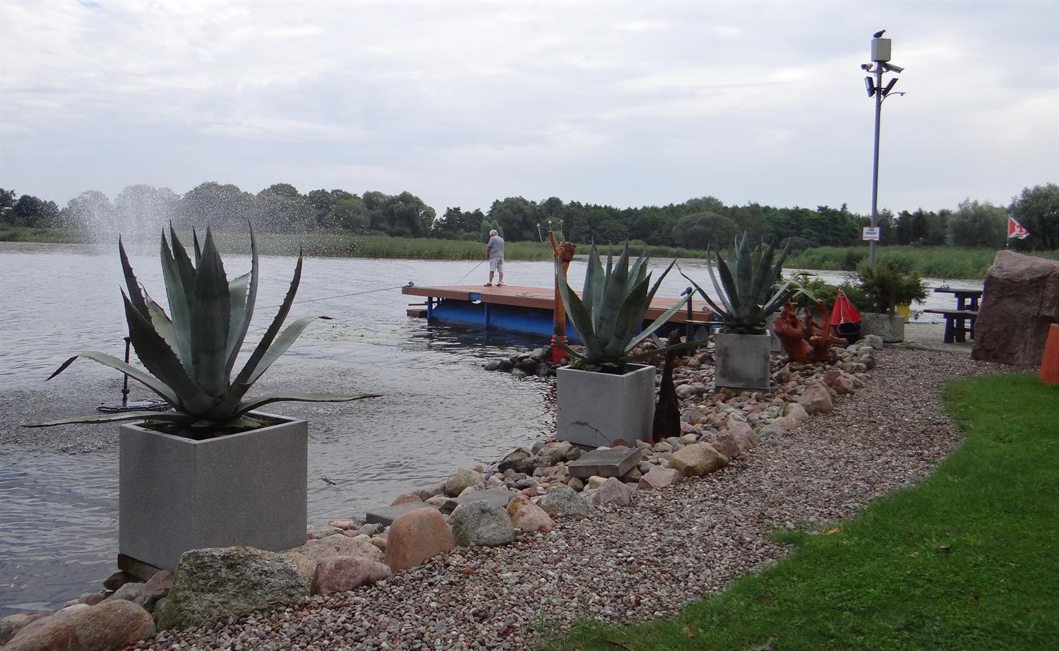 Na nabrzeżu, tuż przy wodzie uwagę zwracają donice z okazami agaw. Kiedy poziom wody w jeziorze znacznie się podnosi lub w czasie tzw. cofki, wtedy te agawy tworzą niesamowitą scenerię – powstaje złudzenie, jakby unosiły się na tafli jeziora wśród innych roślin wodnych, takich jak: grążel żółty, lilia wodna, strzałka wodna, rdestnica połyskująca, gałęzatka kulista, czy moczarka kanadyjska. W części pas przybrzeżny porastają tataraki. Nieco dalej od brzegu iglaki- cis taxus, sosna himalajska inus wallichiana, jałowiec chiński, żywotnik szmaragd, świerk biały, świerk serbski karel.