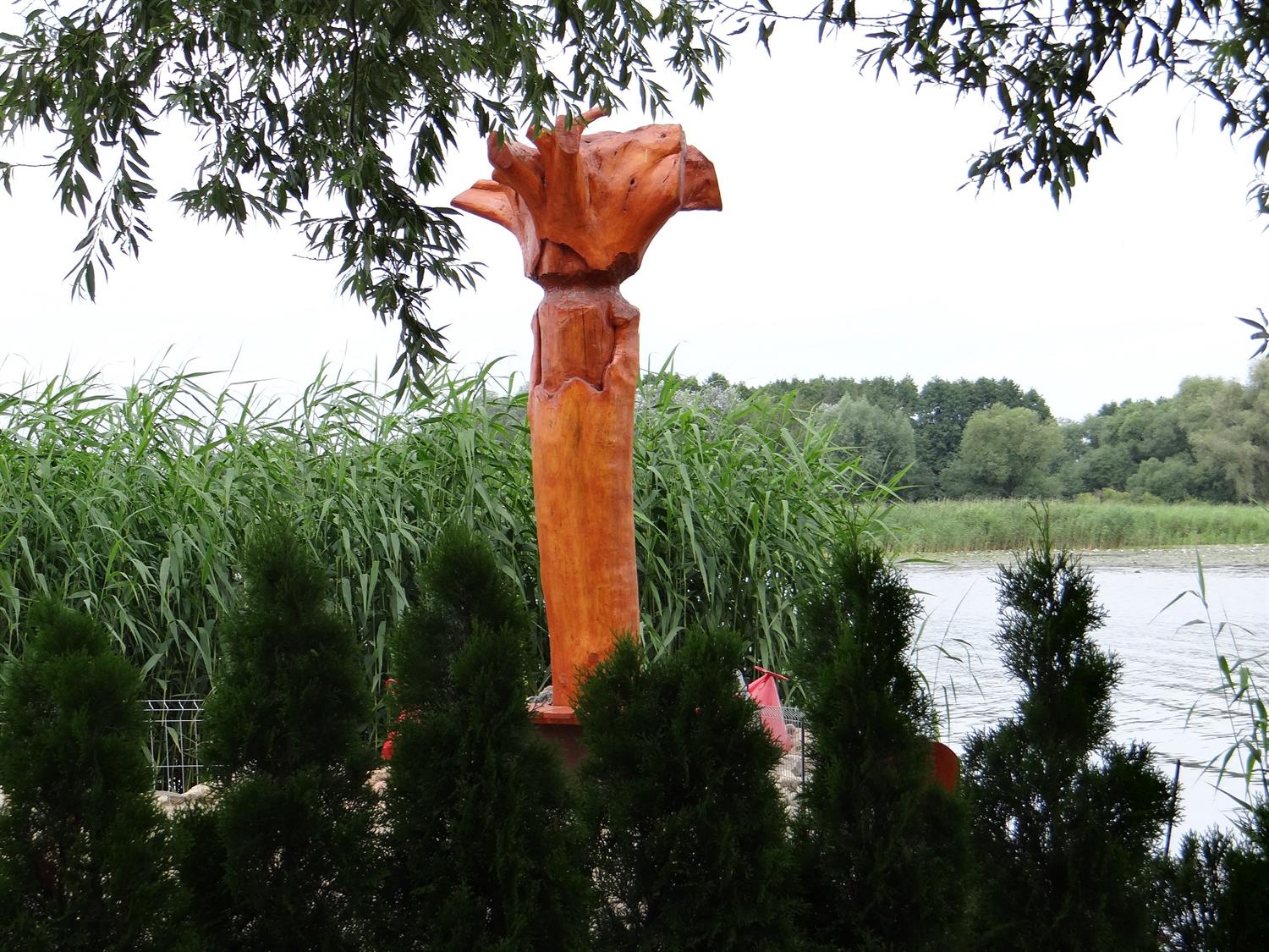 - Czego nie musisz, tego nie wyrzucaj. Tej zasady się trzymamy i tak np. spróchniały pień jednego z wielkich drzew pocięliśmy na mniejsze kawałki zakonserwowaliśmy i teraz służą jako naturalne donice. W nich posadziliśmy różne odmiany iglaków, a że donice są bez dna, to w ziemi będą mogły swobodnie się ukorzeniać - podkreśla Piotr Wódz - Z innego pinia drzewa, które ściął bóbr zrobiliśmy naturalny swoisty totem i ustawiliśmy go przy wejściu do przystani.