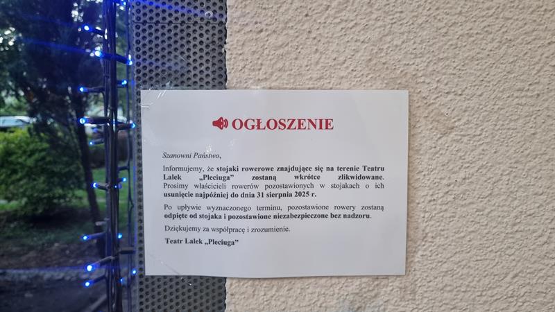 Jak relacjonuje, niedawno przy parkingu rowerowym pojawiła się informacja o jego likwidacji oraz decyzji odpięcia i pozostawienia niezabezpieczonych bez nadzoru rowerów. Na ogłoszeniu nie podano powodów likwidacji parkingu, a pod ogłoszeniem widnieje jedynie podpis: Teatr Lalek „Pleciuga".