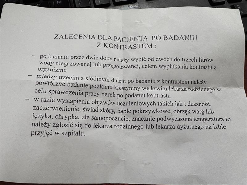 Na tomografię komputerową z kontrastem pana Piotra skierował neurolog, skierował też na badanie poziomu kreatyniny (do wykonania przed tomografią). Po badaniu z kontrastem dostał zaś kartkę z zaleceniami, a na niej m.in. zapis: „między trzecim a siódmym dniem po badaniu z kontrastem należy powtórzyć badanie poziomu kreatyniny we krwi u lekarza rodzinnego w celu