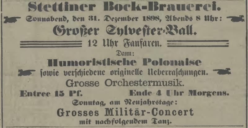 Ogłoszenie prasowe z dnia 31.12.1898 roku, zamieszczone w „Pommersche Zeitung”